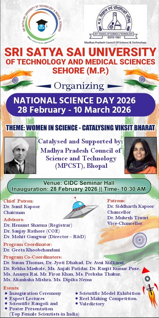 Since its founding in 2013 by merging of several multi-disciplinary institutions, Sri Satya Sai University of Technology and Medical Sciences Sehore, Bhopal (MP) is acclaimed for its outstanding contribution to teaching, research and service in Nation building. Today, the University stands to meet the enormous aspirations and expectations of society. Society wants us to nurture professionals and scholars of high caliber, who can offer solutions to a broad range of issues. This requires excellence in teaching and research at par with the best in the world.
